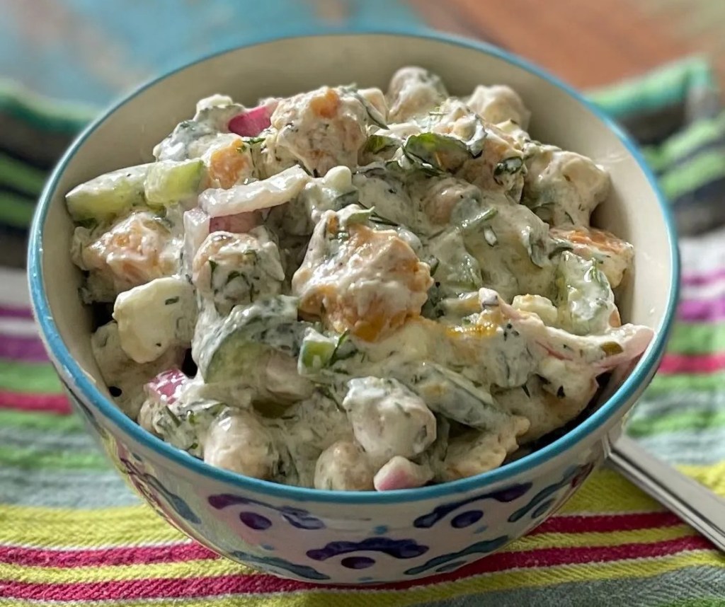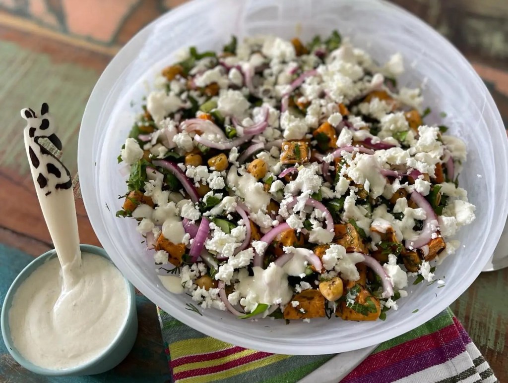 - Toss the chickpeas and sweet potato with the herbs in the salad bowl. Now scatter the red onions over and crumble the feta over.