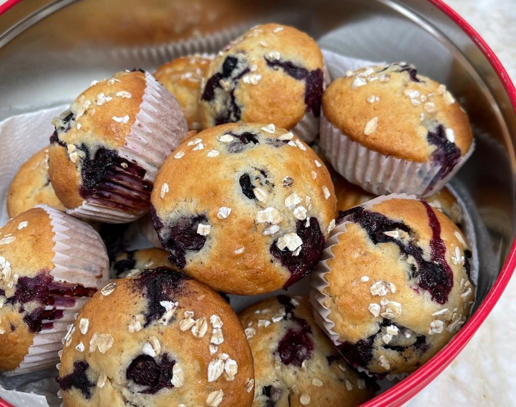 - I like to scoop my batter into the muffin tins and then place 3 – 4 berries in each muffin depends on their size.