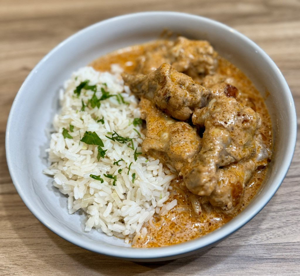 Another Curry to enjoy! Years ago I found an old Clover SA recipe book at my in-laws with some amazing curry dishes, among them this really yummy Butter Chicken recipe. I have made it so many times and it is my go to recipe to make for the crowds. It has evolved over the years as I have tweaked it here and there to what is today. You can easily double the recipe. It is simple and very ‘forgiving’. To make it even easier, just use some shop bought items like bottled ginger/garlic paste. Then you will only need 1tbs (15ml) in your recipe. I do like to serve it with rice and I normally make an onion rice, but even plain rice goes well with it. You can go all out and have a nice warm naan on the side to scoop up the last bit of the sauce. Have fun playing with this recipe.