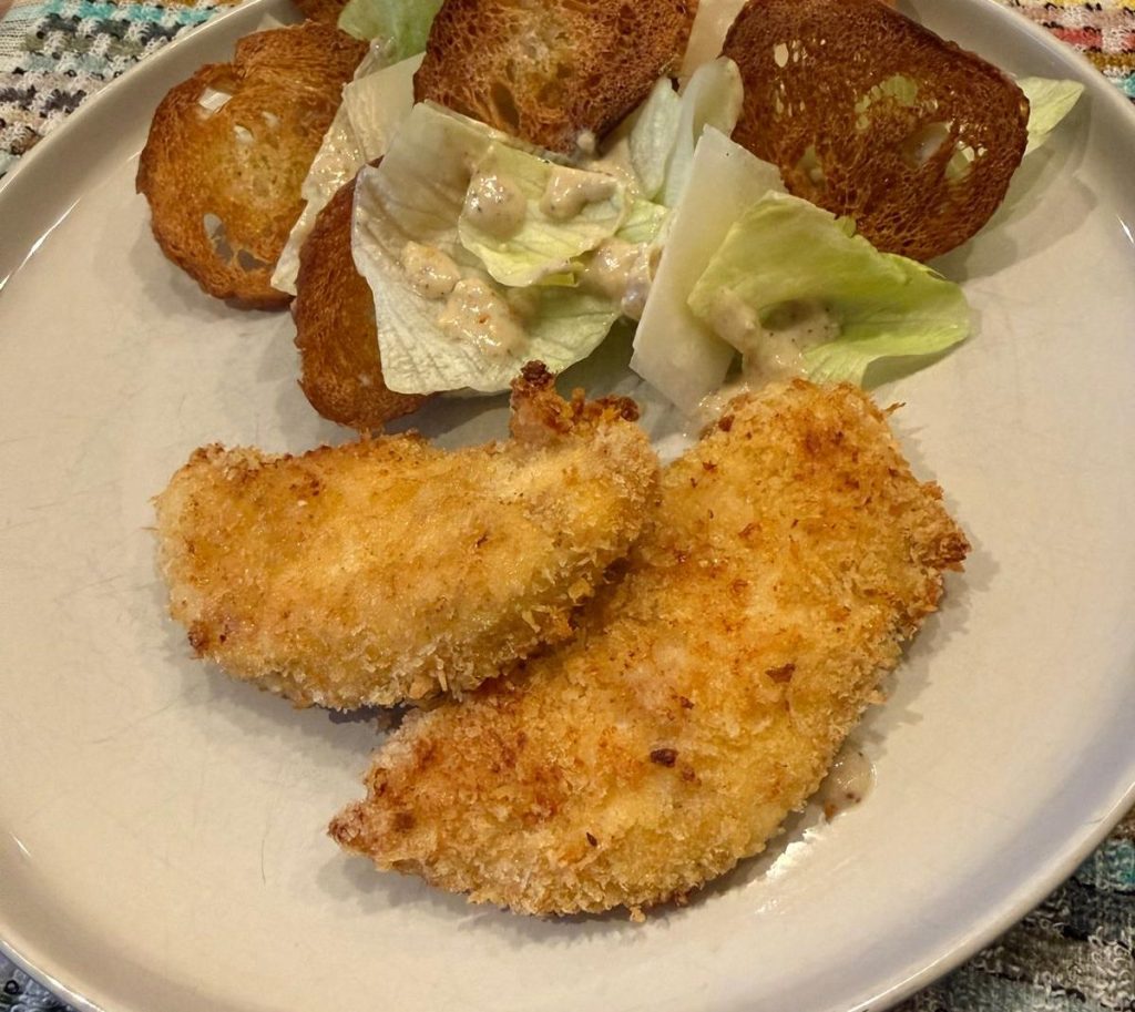 For the last 18 years plus these little morsels of yumminess became part of the week day dinners especially for all the children I worked with. It is easy to prepare and you can make a lot and just freeze it in portions. Take them from the freezer and bake and enjoy it just like that with mash and peas or in a chicken fillet burger or my favourite as part of a Chicken Caesar Salad. They are also great cold so you can pack it in the school lunch boxes the next day. Have fun playing with this recipe.